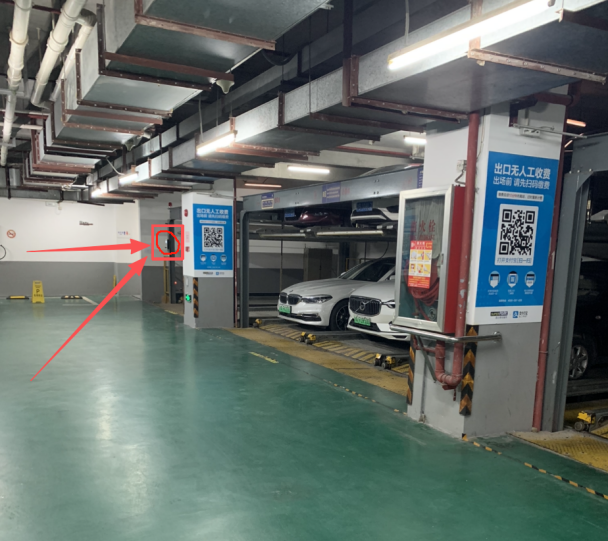 图11 操作人员操作时视线被挡,难以观察到立体车库设备中的人员出入情况 (图中箭头所指位置为操作面板位置) |